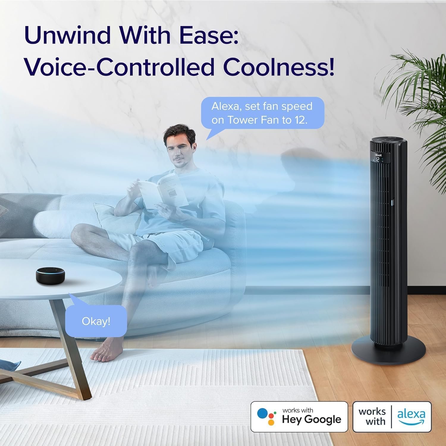 LEVOIT Smart 25dB Silent Tower Fan 42 Inch, 7.9m/s Powerful Electric Cooling Fan for Bedroom, Quiet Mark Certified with DC Motor, 90° Oscillating and 60° Up and Down, Voice Control 4 Modes 12 Speeds, 2 Years Warranty.