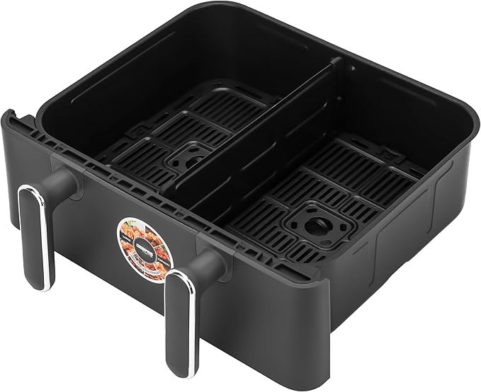 - ✅ INDEPENDENTLY CONTROLLED COOKING ZONES: The temperatures in the baskets can be individually controlled and have a left and right basket temperature and time display with a sync finish and dual cook options. It also has a shake reminder during cooking time.